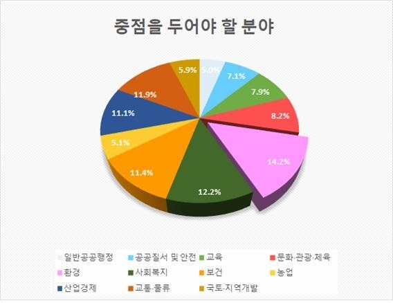 경남 김해시민들은 시 예산 편성 때 앞으로 가장 중점을 두어야 할 분야로 '환경'을 꼽았다.