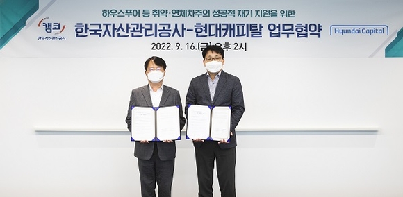캠코는 16일 현대캐피탈빌딩 대회의실에서 현대캐피탈과 '하우스푸어 등 취약·연체차주의 성공적 재기지원을 위한 업무협약'을 체결했다고 밝혔다. 이번 협약식에는 캠코 김귀수 가계지원본부장, 현대캐피탈 백연웅 사업지원본부장이 참석했다.