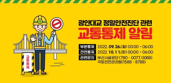 부산시설공단은 광안대교 정밀안전진단을 위한 재하시험을 위해 9월 26일, 10월 11일 두차례 교통통제를 시행한다고 19일 밝혔다.