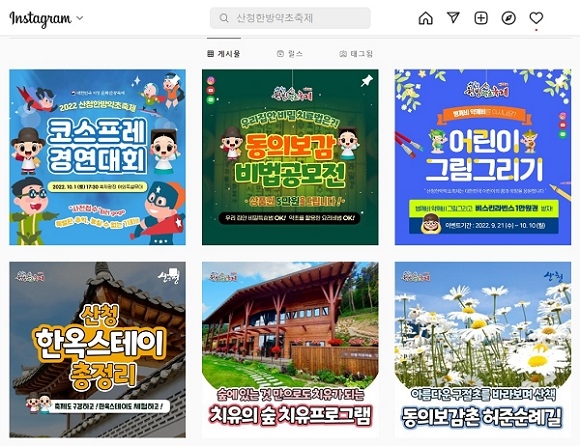 현재 축제를 홍보하는 계정에는 코스프레대회, 산청한방약초 정오퀴즈, 병깨비&약깨비 어린이 그림그리기, 축제 소문내기 이벤트, 우리 가족 동의보감 비법 UCC(숏츠) 콘테스트 등의 이벤트를 홍보하는 내용의 게시물이 등록돼 있다.