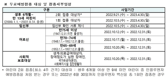 우선, 생후 6개월~만 13세 어린이(2009년 1월 1일~2022년 8월 31일 출생) 중 2회 접종 대상자는 21일부터 가능하고, 1회 접종 대상자는 10월 5일부터 가능하다.