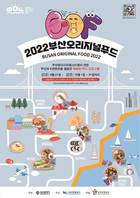 부산관광공사는 '2022 부산원아시아페스티벌' 개최 달인 오는 10월 1일부터 한 달간 부산에서 부산오리지널푸드 체험형 프로그램을 운영한다고 21일 밝혔다.
