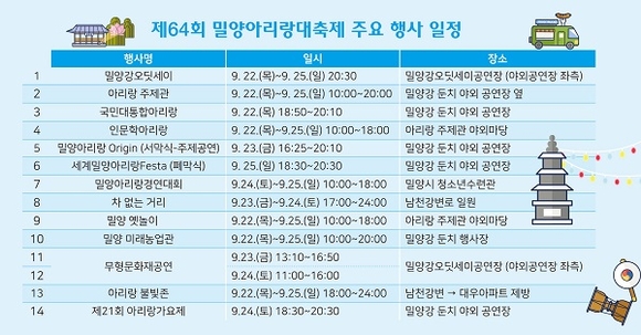 시민, 지역단체들과 함께 지난 1년간 축제를 차근차근 준비해 온 밀양시는 '잇다, 세계속의 밀양아리랑'이라는 슬로건 아래 밀양아리랑과 즐길거리 가득한 프로그램으로 관광객을 기다리고 있다.