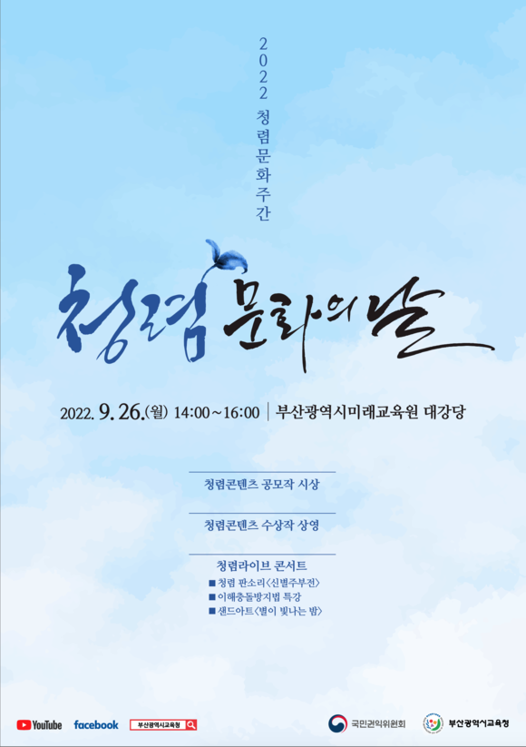 부산시교육청은 오는 26일부터 30일까지 '2022 청렴 문화 주간' 행사를 운영한다고 22일 밝혔다.