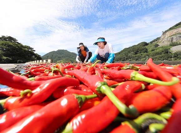 절기상 추분을 하루 앞둔 22일 경남 함양군 마천면 장철안씨 부부가 가을햇살아래 고추를 손질하고 있다. (사진=함양군 제공)