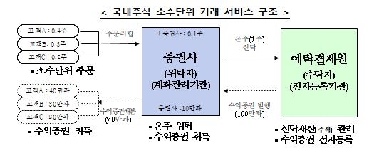 이에 금융위는 지난 13일 '국내외 소수단위 주식거래 허용방안'을 발표했으며, 예탁결제원은 시장 요구 수용과 정책지원을 위해 국내주식 소수단위 거래 서비스 도입을 적극적으로 추진해 왔다.