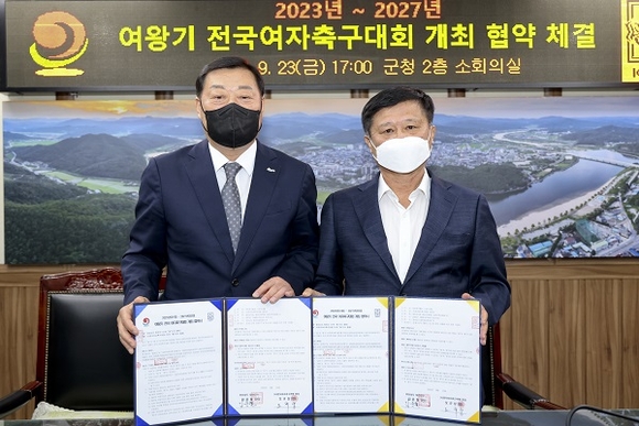 이날 협약식에는 김윤철 군수와 조삼술 군의장, 오규상 한국여자축구연맹회장, 김해은 군체육회장, 도영환 군축구협회장을 비롯한 관계자들이 참석한 가운데 2023년~2027년 여왕기 전국여자축구대회 개최지를 확정했다.