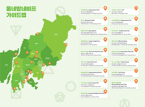 부산진구의 부산시민공원을 제외하면 금정구 범어사, 사하구 다대포해변공원, 서구 송도오션파크, 수영구 밀락더마켓, 동구 북항 친수공원과 차이나타운 등 16개 장소가 올해 새롭게 발굴됐다.