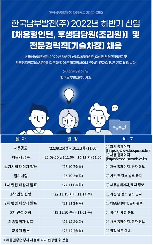 한국남부발전은 오는 10월 11일까지 전문경력직(기술차장), 채용형인턴, 별정직[후생담당원(조리원)] 등 총 46명을 채용한다고 밝혔다.