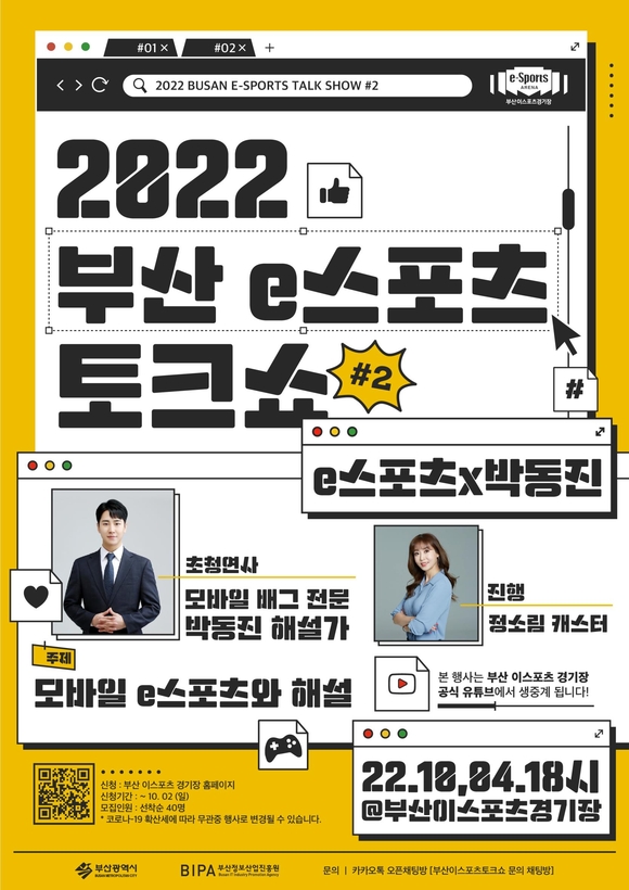 부산정보산업진흥원은 오는 10월 4일 오후 6시 부산이스포츠경기장(브레나)에서 '2022 제2회 부산 e스포츠 토크쇼'를 개최한다고 28일 밝혔다.