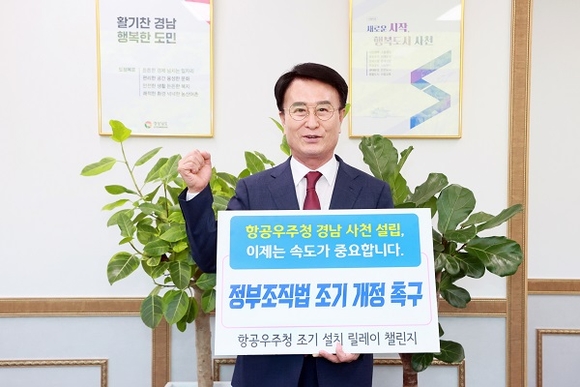 박 시장은 이날 '항공우주청 경남 사천 조기 설립, 이제는 속도가 중요합니다. 정부조직법 조기 개정 촉구'라고 적힌 피켓을 들고, 항공우주청 조기 설립 챌린지에 시민들의 동참을 촉구했다.
