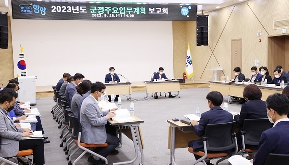 이번 보고회는 민선 8기의 군정지표인 '힘찬도약! 함께여는 함양' 실현을 위한 신규사업을 발굴하고 내년에 중점적으로 추진할 시책을 검토하기 위해 마련된 자리로 부서별 사업계획 보고, 질의응답 순으로 진행됐다.