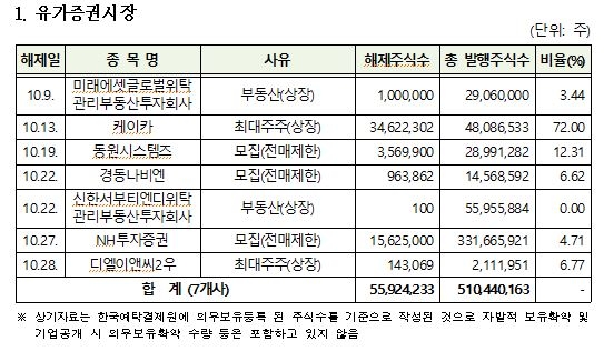 10월 중 의무보유등록 해제 주식수는 전월(1억 6283만주) 대비 6.2% 증가, 지난해 동월(3억 1007만주) 대비 44.2% 감소했다.