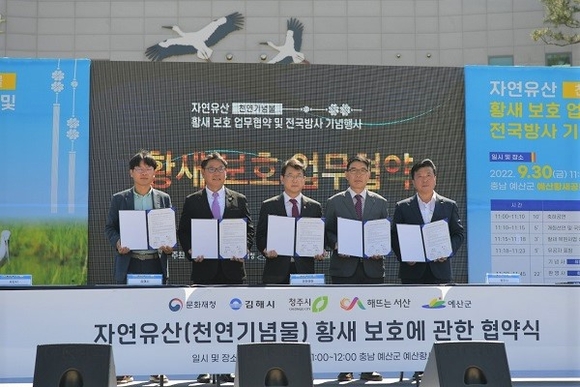 경남 김해시는 30일 충남 예산황새공원에서 문화재청이 주관한 황새(천연기념물 제199호, 멸종위기 야생생물Ⅰ급) 보호 업무협약과 전국 방사 기념행사에 참석했다.