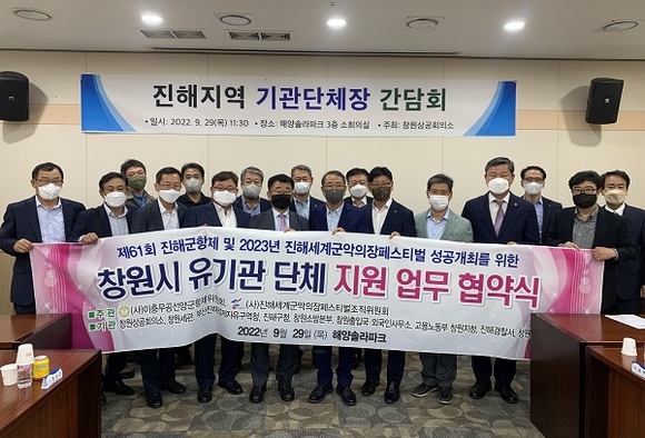 군항제위원회는 지난달 29일 해양솔라파크 3층에서 열린 진해지역 기관단체장 간담회에서 창원상공회의소 등 지역 기관 단체와 제61회 진해군항제 및 2023년 진해세계군악의장페스티벌 성공개최를 위한 '창원시 유기관 단체 지원 업무 협약식'을 가졌다.