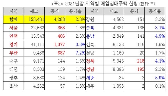 지역별 매입임대주택 공가 호수는 2021년말 기준 경기도가 1377호로 가장 많고, 부산 687호, 인천 406호, 서울 368호, 경북 218호, 경남 195호, 강원 151호 순이다.
