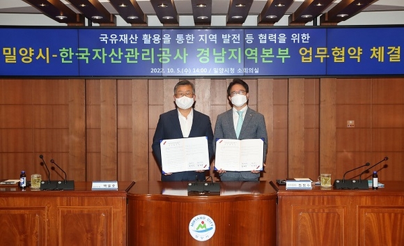 경남 밀양시는 5일 시청 소회의실에서 한국자산관리공사(캠코) 경남지역본부와 '국유재산 활용을 통한 지역 발전 등 협력을 위한 업무협약'을 체결했다.