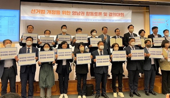 더불어민주당 영남지역 5개 시·도당위원장이 공동으로 선거법 개정을 촉구하는 결의문을 채택했다.
