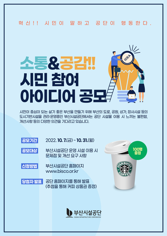 공단 누리집을 통해 시민 누구나 참여 가능하며, 추첨을 통해 시민 100여 명에게 소정의 커피음료 기프티콘을 증정한다.