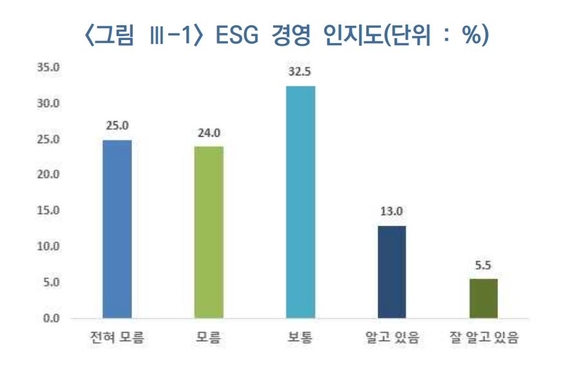업체들은 애로사항으로 '비용 부담'(41.5%)을 가장 높게 꼽았다. ESG 전문인력 부족(23%), ESG 대응 가이드라인에 대한 정보 부족(14%), ESG 경영 도입 필요성에 대한 확신 부족(8.5%)도 애로사항으로 지적됐다.