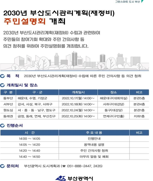 부산시가 '2030 부산도시관리계획(재정비) 수립용역'과 관련 16개 구·군을 대상으로 권역별 주민설명회를 개최해 시민들의 이해를 돕고 다양한 의견 수렴에 나선다.