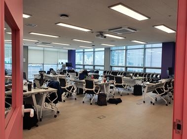 6층에는 교육실 3개(50인실 2개, 90인실 1개), 커뮤니티 라운지, 미팅공간, 휴게공간으로 구성돼 있다. 고용노동부 K-digital Training 사업과 연계한 인공지능, 클라우드, 응용소프트웨어 과정이 운영된다.