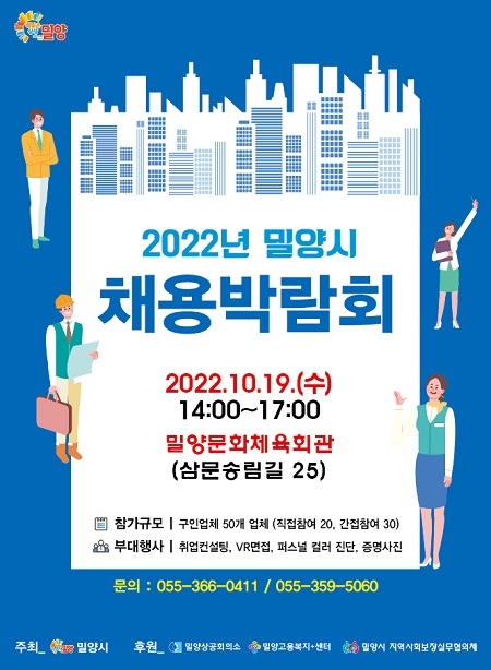 경남 밀양시가 오는 19일 삼문동 밀양문화체육회관에서 지역기업의 우수인력 채용과 시민의 일자리 지원을 위해 '2022년 밀양시 채용박람회'를 개최한다.