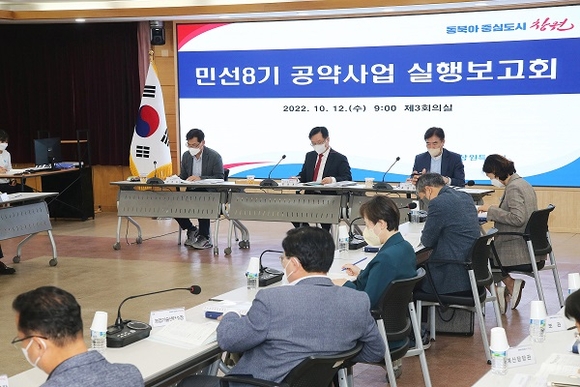 경남 창원시는 12일 오전 9시 제3회의실에서 시장, 제1·2부시장, 실·국·소장, 공약업무 추진 부서장 등이 참석한 가운데 '민선 8기 공약사업 실행보고회'를 개최했다고 밝혔다.