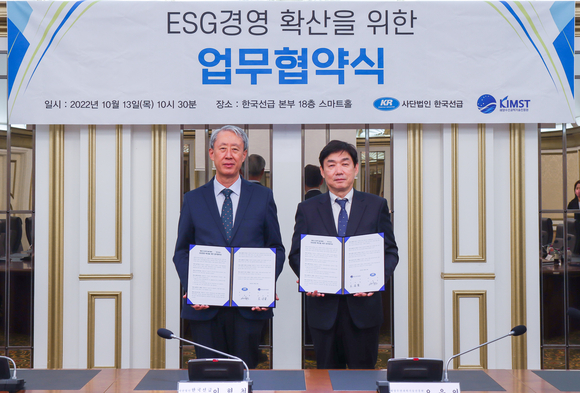 한국선급(KR)은 지난 13일 해양수산과학기술진흥원(KIMST)과 'ESG 경영확산을 위한 업무협약'을 체결했다고 밝혔다.