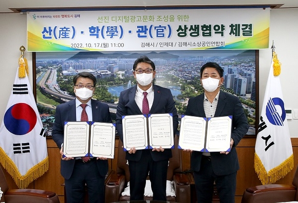 경남 김해시는 지난 17일 시장실에서 인제대학교, 김해시소상공인연합회와 우수 인재 양성, 지역경제 활성화, 쾌적한 도시환경 조성을 목적으로 산·학·관 상생협약을 체결했다.
