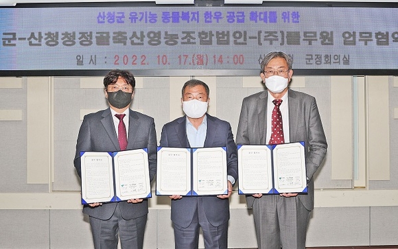 18일 군에 따르면 지난 17일 산청청정골축산영농조합법인, ㈜풀무원과 유기농동물복지 한우 공급 확대를 위한 업무협약(MOU)을 체결했다.