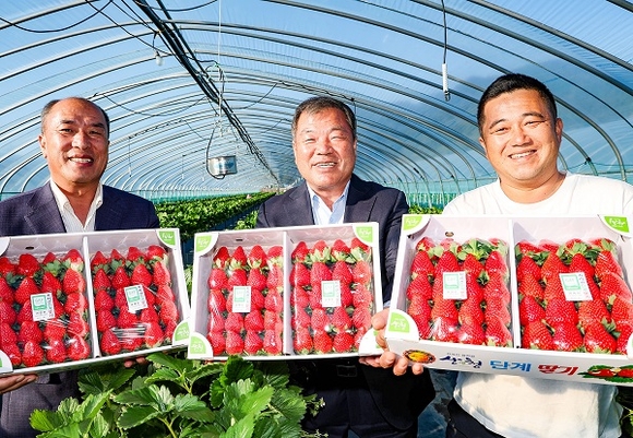 18일 경남 산청군 신등면 단계리 권영민씨 농가에서 이승화 산청군수 등 관계자들이 '지리산 산청 딸기'를 선보이고 있다. '산청 딸기'는 높은 당도와 선명한 빛깔은 물론 저장성이 탁월하며 과육이 충실하고 신선함이 오래 유지돼 소비자들에게 호평을 받고 있다. (사진=산청군 제공)