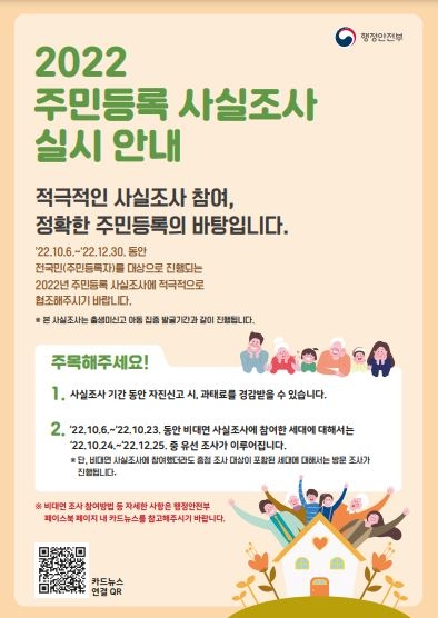 부산 기장군은 오는 12월 30일까지 관내 전 세대를 대상으로 2022년도 주민등록 사실조사를 실시한다고 19일 밝혔다.
