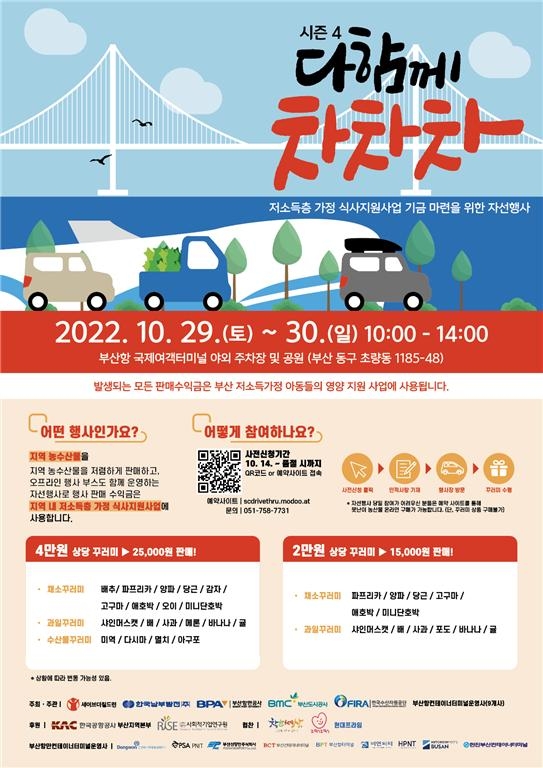 부산항만공사(BPA)는 오는 29일, 30일 오전 10시부터 오후 2시까지 부산국제여객터미널 야외주차장에서 자선행사 '제4회 다함께 차차차'를 개최한다고 20일 밝혔다.