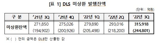 한국예탁결제원은 2022년 9월말 기준 DLS 미상환 발행잔액은 31조 5918억원으로 전년 동기 대비 16.2% 증가했으며, 직전 분기 대비 7.8% 증가했다고 21일 밝혔다.
