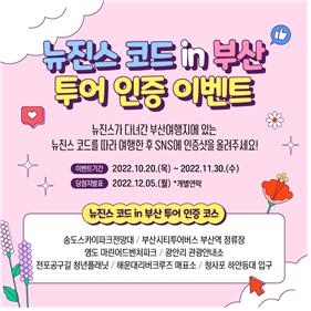 이번 '뉴진스 코드 in 부산' 투어 SNS 인증 이벤트는 오는 11월 30일까지 실시하며, 자세한 내용은 부산관광포털, 유튜브 및 인스타그램 '비짓부산' 채널을 통해 확인 가능하다.