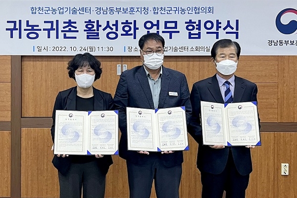 합천군농업기술센터는 경남동부보훈지청, 합천군귀농협의회는 24일 센터 소회의실에서 귀농귀촌 활성화를 위한 업무협약을 체결하고 관련 사업에 협력해 나가기로 합의했다.