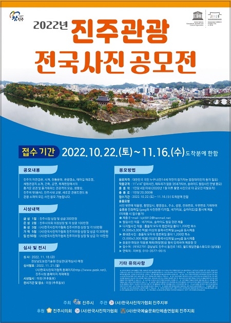 경남 진주시는 시의 관광명소, 축제, 전통문화, 자연경관 등을 소재로 한 전국사진 공모전을 오는 11월 16일까지 접수한다고 24일 밝혔다.