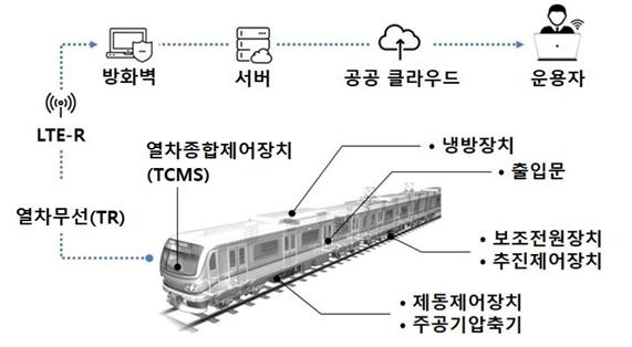 수집된 전동차 데이터가 철도통합무선망(LTE-R)을 통해 공공 클라우드로 전송되면, 머신 러닝이 데이터를 분석해 전동차 고장을 예측·진단한다.