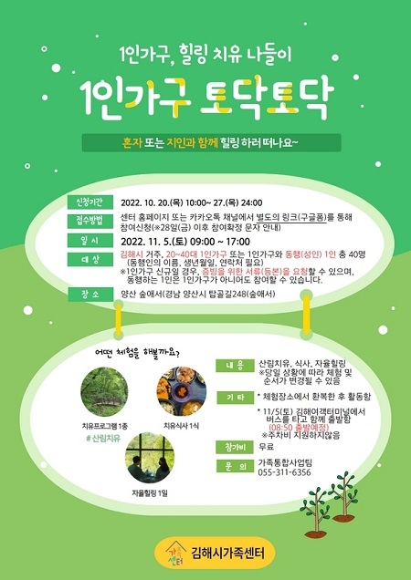 신청 등 자세한 내용은 김해시가족센터 누리집, 카카오톡 채널을 참고하거나 센터 가족통합사업팀으로 문의하면 된다.