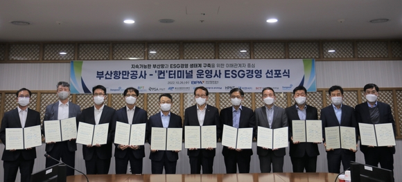 부산항만공사(BPA)는 26일 2022년도 제5차 부산항 컨테이너터미널 운영사 사장단 간담회를 개최하고 자생력을 갖춘 글로벌 허브 항만으로 도약하기 위한 부산항 ESG 경영 선포식을 가졌다고 밝혔다.
