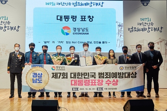 도는 '제7회 대한민국 범죄예방대상' 공모에서 <'같이'가 '가치' 있는 No! Crime 경남, 안전을 품다>라는 주제의 지역 맞춤형 안전정책의 성과를 인정받아, 광역도 단위기관으로는 최초로 전국 1위인 종합우수 성적을 거두며 대통령 표창 수상자로 선정됐다.