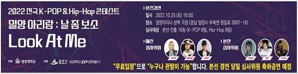 경남 밀양시가 오는 29일 밀양아리나 성벽극장에서 '밀양아리랑 전국 K-팝 & 힙합 경연대회'를 연다.