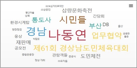 분석 결과 올해 상반기 대비 민선 8기 100일간 긍정단어는 13% 증가했으며, 낙동강유역 상생협력, 도민체전, 통도사 미디어아트, 반다비 체육관 등 긍정 키워드인 기대, 노력으로 평가됐다. 또 철거, 혐의, 강제 등 부정 키워드는 평산마을 집회 관련으로 확인됐다.