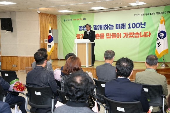 홍 시장은 “김해시의 비전과 목표인 '꿈이 이루어지는 따뜻한 행복도시 김해'의 기저에는 농업이 있다”며 “농업 경쟁력 강화와 정주환경 개선이란 두 가지 큰 목표를 중심으로 스마트팜 조성과 농촌개선사업을 병행해 나가겠다”고 밝혔다.