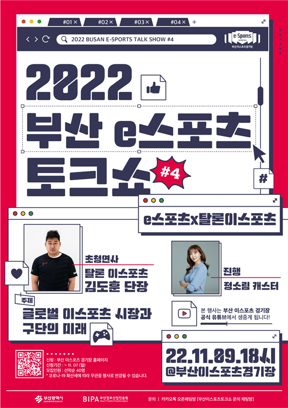 부산정보산업진흥원은 오는 9일 오후 6시부터 부산이스포츠경기장(브레나)에서 '2022 제4회 부산 e스포츠 토크쇼'를 개최한다고 4일 밝혔다.