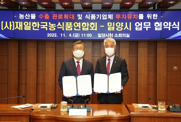 경남 밀양시는 4일 일본내 K푸드 수출 활성화를 위해 앞장서고 있는 사단법인 재일한국농식품연합회 회장단을 초청해 밀양 농식품 수출 판로 확대를 위한 업무협약(MOU)을 체결했다.