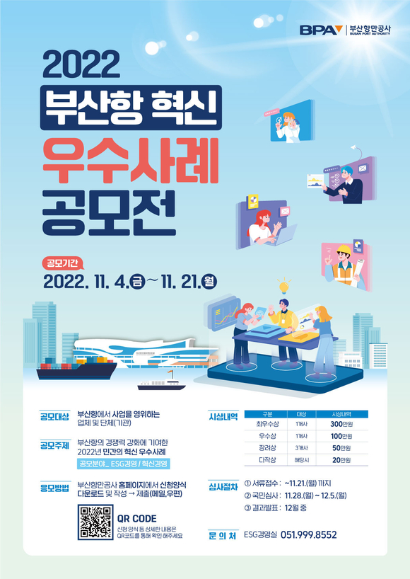 부산항만공사(BPA)는 오는 21일까지 부산항 내에서 사업을 영위하는 업·단체를 대상으로 '2022 부산항 혁신 우수사례 공모전'을 개최한다고 4일 밝혔다.
