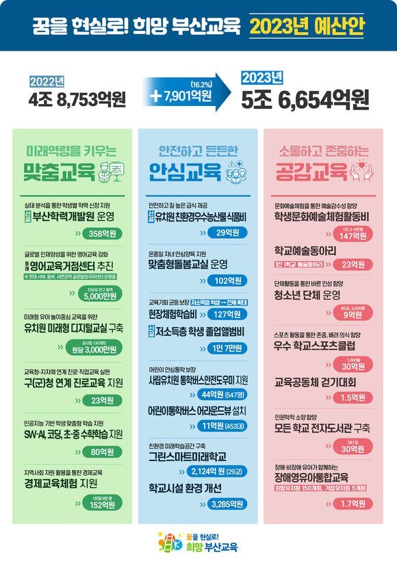 부산시교육청은 올해보다 16.2% 증가한 5조 6654억원 규모의 '2023년도 부산광역시교육비특별회계 예산안'을 부산시의회에 제출했다고 8일 밝혔다.
