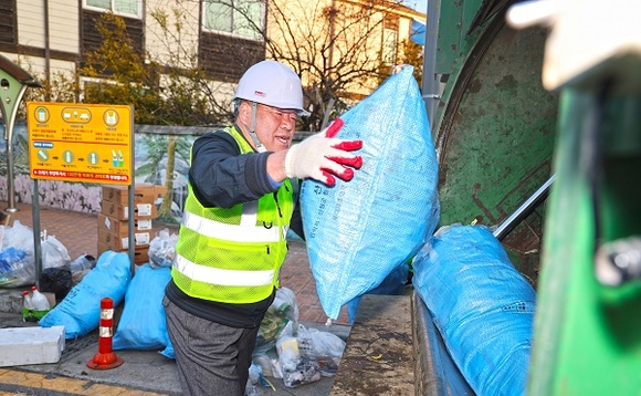 이승화 산청군수가 생활쓰레기 수거 등 환경정화 활동을 펼치며 생활폐기물 수집 및 운반에 대한 현장 점검에 나섰다.